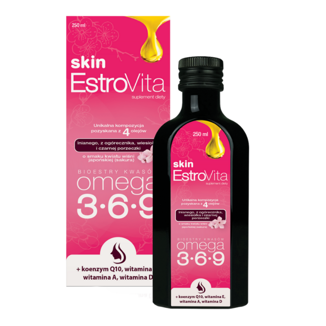Estrovita Skin to suplement diety, który zawiera kwasy omega-3, -6, -9 w wysoce przyswajalnej postaci estrów, wyizolowanych z 4 olejów roślinnych: oleju lnianego, oleju z wiesiołka, oleju z ogórecznika, oleju z czarnej porzeczki. Postać estrów pozwala na to, aby duża część przyjmowanego preparatu została przyswojona przez organizm.