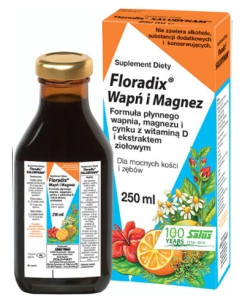 Floradix Wapń i Magnez jest produktem w postaci smacznego toniku, który zawiera składniki wspomagające prawidłowe funkcjonowanie organizmu. Zawarty w produkcie cynk wykazuje właściwości antyoksydacyjne, a rumianek i koper wpływają na prawidłowe funkcjonowanie układu odpornościowego. Wapń jest ważnym składnikiem mineralnym organizmu, który bierze udział w wielu mechanizmach regulacyjnych i jest potrzebny do utrzymania zdrowych kości i zębów. Witamina D wspomaga wchłanianie i wykorzystywanie wapnia oraz fosforu z przewodu pokarmowego. Wapń i witamina D są potrzebne dla prawidłowego wzrostu i rozwoju kości u dzieci. Magnez jest składnikiem potrzebnym do budowy kości i zębów, pomaga w prawidłowym funkcjonowaniu mięśni i układu nerwowego. Cynk jest ważnym składnikiem dla prawidłowego wzrostu i rozwoju komórek oraz wspomaga prawidłowe działanie układu odpornościowego. Występowanie tych trzech pierwiastków łącznie (wapń, magnez, cynk) jest bardzo istotne, gdyż w procesie formowania kości wapń nie może być prawidłowo przyswajany bez udziału magnezu i cynku. Produkt przeznaczony jest dla osób w stanach zwiększonego zapotrzebowania na wapń, magnez, cynk i witaminę D jako uzupełnienie diety, a w szczególności: